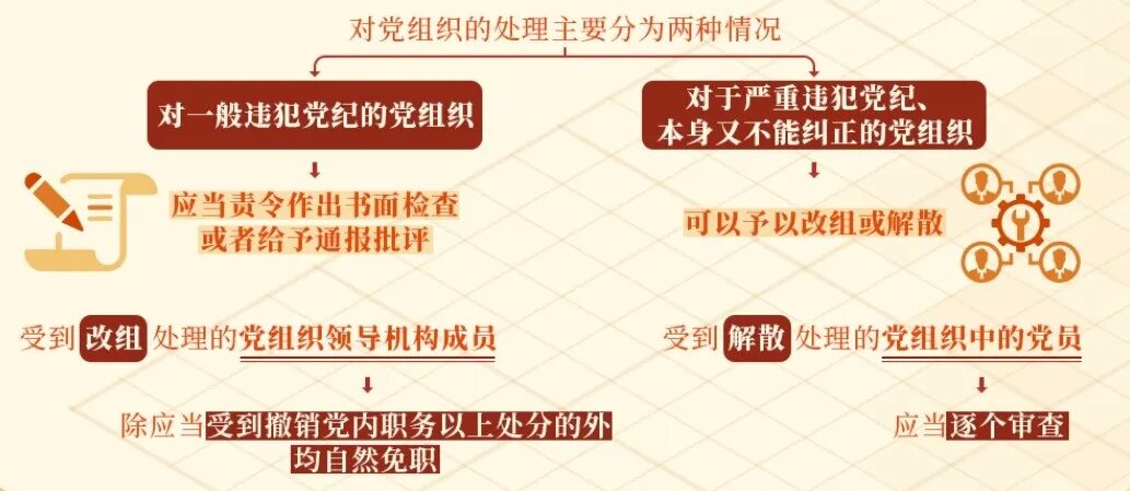 根據(jù)《中國共產(chǎn)黨紀(jì)律處分條例》規(guī)定,對黨組織的處理主要分為兩種情況:對一般違犯黨紀(jì)的黨組織,上級黨組織應(yīng)當(dāng)責(zé)令其作出書面檢查或者給予通報批評;對于嚴(yán)重違犯黨紀(jì)、本身又不能糾正的黨組織,上一級黨的委員會在查明核實(shí)后,根據(jù)情節(jié)的嚴(yán)重程度,可以予以改組或解散。