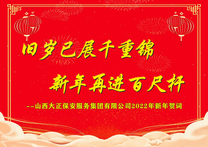 2022年是黨的二十大勝利召開之年,也是大正保安集團(tuán)改革發(fā)展歷程中極為關(guān)鍵的一年。誠摯希望全體大正保安人能夠一如既往地用付出和堅(jiān)守詮釋大正保安集團(tuán)的責(zé)任和擔(dān)當(dāng),也誠摯希望各界朋友能夠一如既往地關(guān)心和支持大正保安集團(tuán)的建設(shè)和發(fā)展,讓我們攜手同行、守望相助,守正篤實(shí)、久久為功,加快建設(shè)國內(nèi)一流的綜合型保安服務(wù)集團(tuán),努力在忻州全方位推動高質(zhì)量發(fā)展、奮力譜寫全面建設(shè)社會主義現(xiàn)代化國家忻州篇章的新征程中再創(chuàng)佳績,以優(yōu)異成績迎接黨的二十大勝利召開!