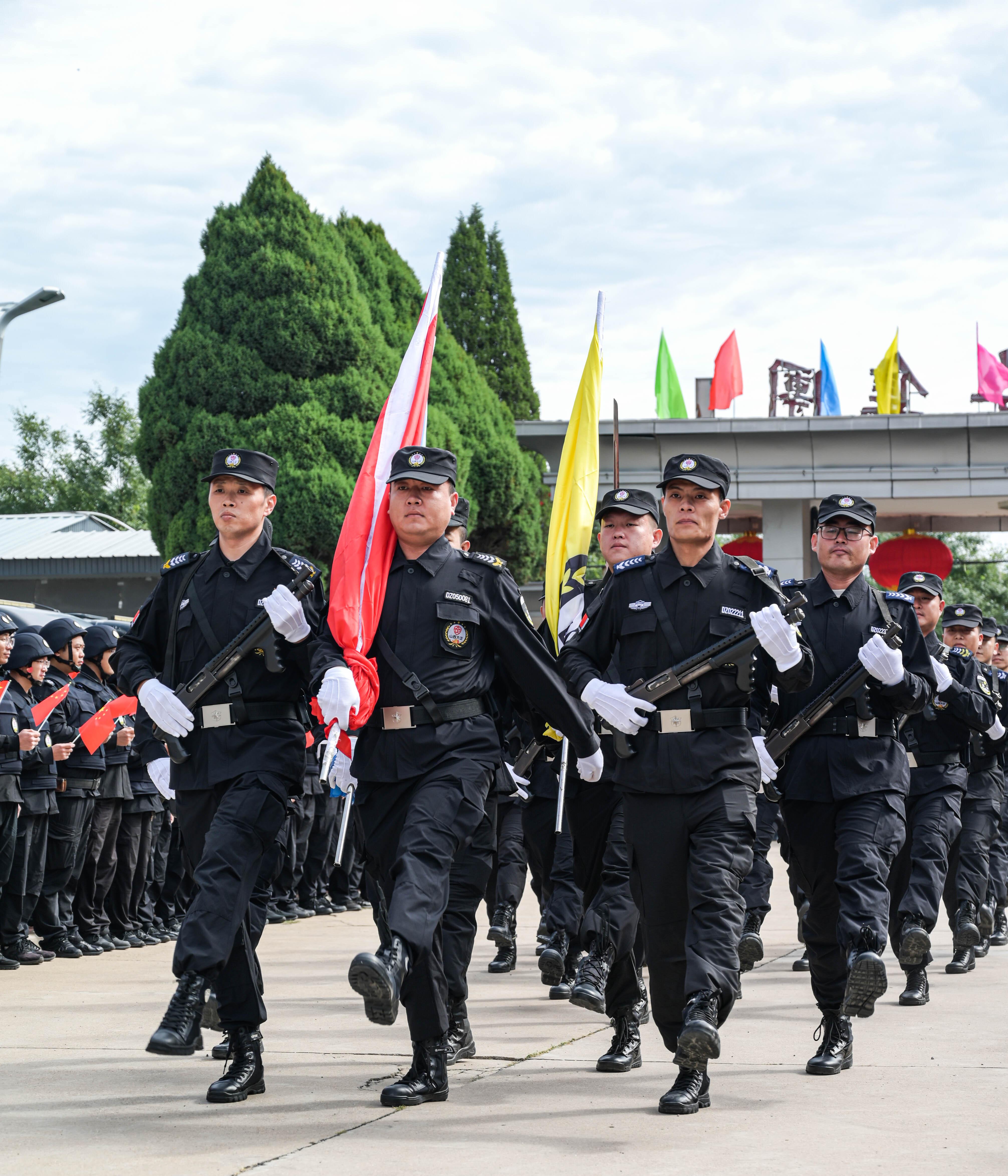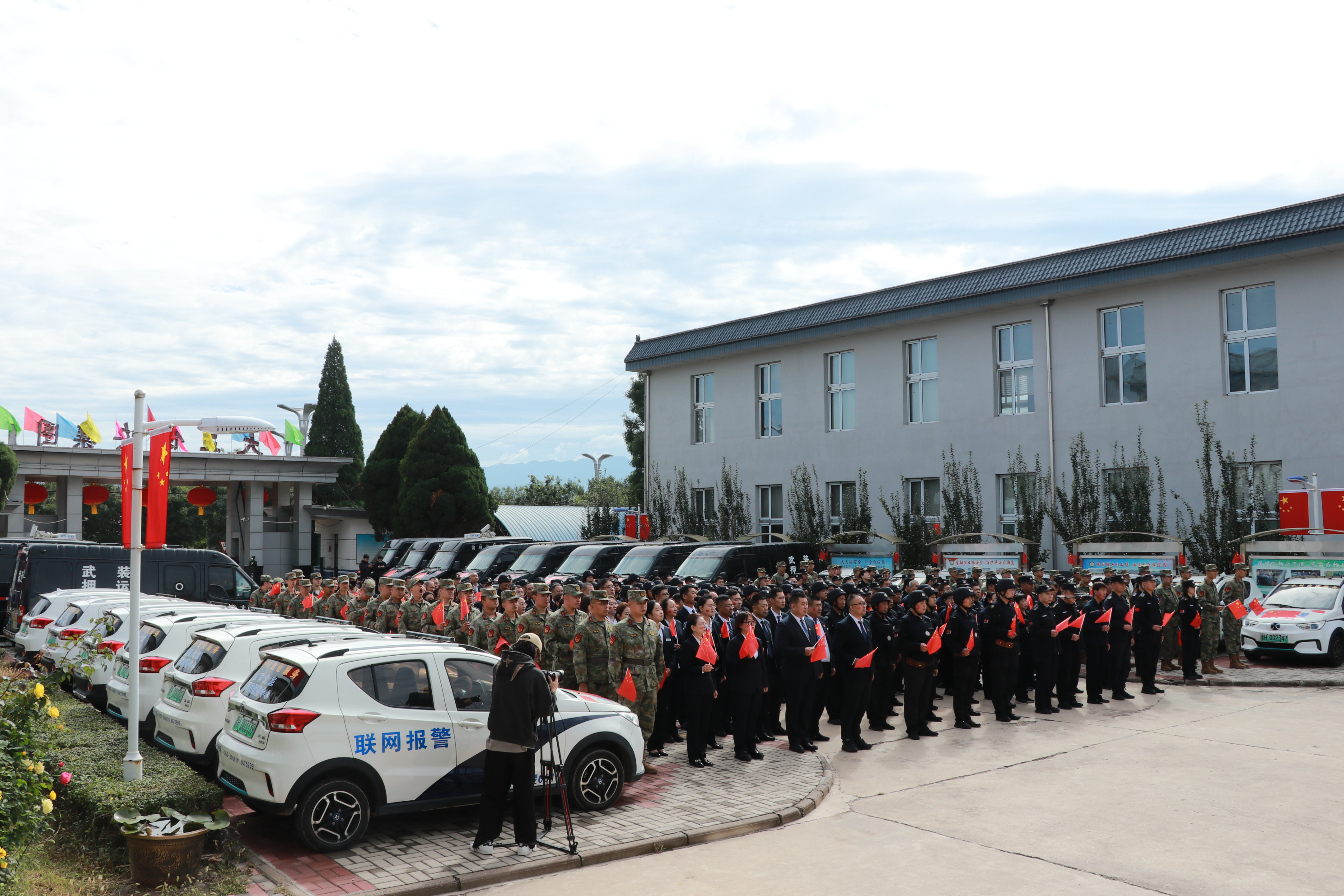 節(jié)日的公司院內(nèi)外,四周花團錦簇,大門口燈籠高掛、彩旗飄揚,為節(jié)日增添了濃厚的喜慶氛圍。公司運鈔車、巡邏車、運兵車干凈整潔,排列在場地兩側(cè),升旗儀式更顯隆重。9時30分,集團公司、各子公司領(lǐng)導(dǎo)和機關(guān)各部門、城區(qū)員工共300多人整齊列隊,懷著激動的心情,手持小國旗,臉上貼著愛國貼紙、洋溢幸福的笑容,眼神中充滿了對祖國的熱愛和對升旗儀式的期待。