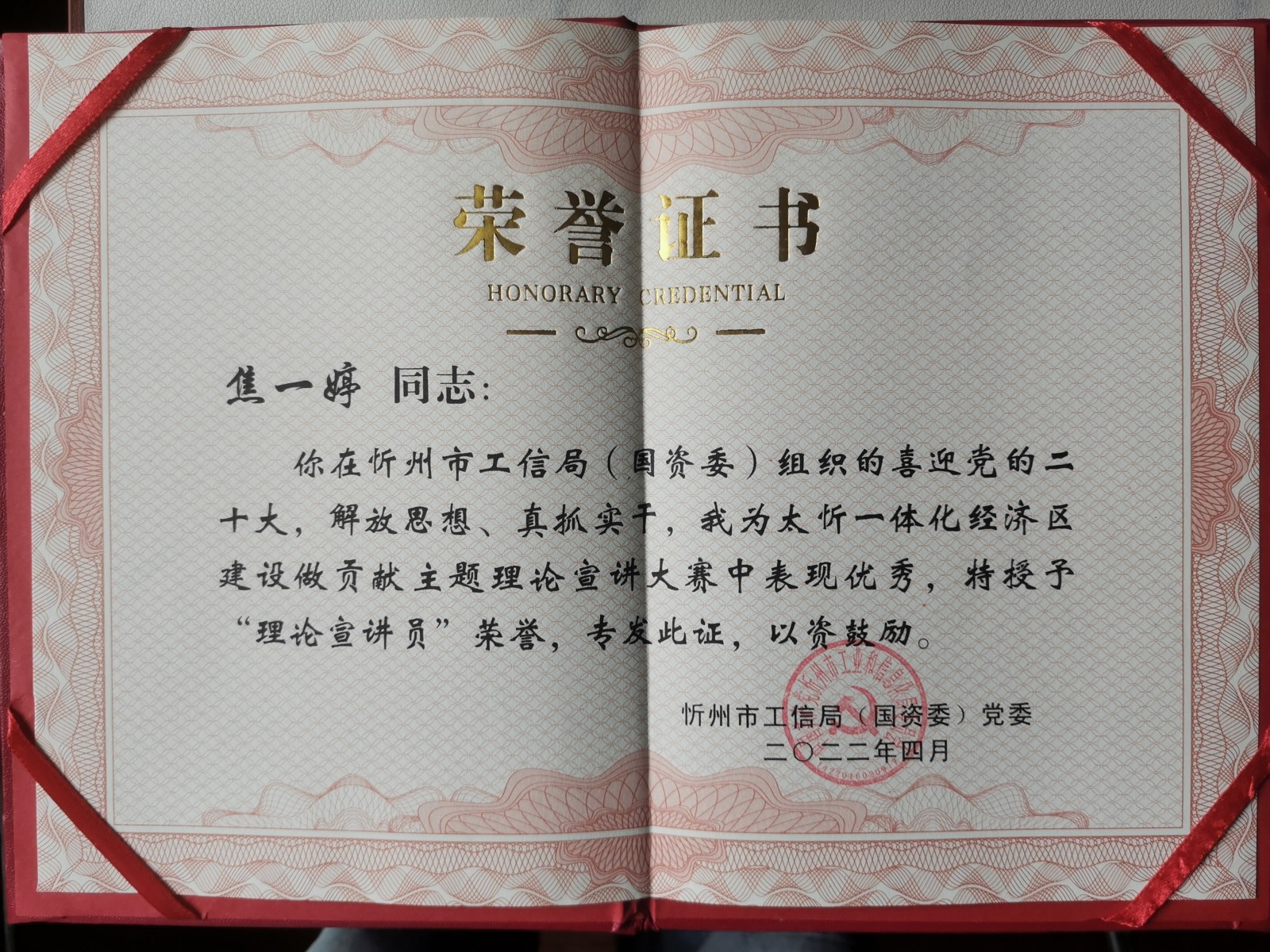 3月21日,以喜迎黨的二十大,解放思想、真抓實干,我為太忻一體化經(jīng)濟區(qū)建設(shè)做貢獻為主題的“忻州市第二屆理論宣講大賽”中,我公司參賽人員焦一婷緊扣演講主題,以“忻州市創(chuàng)建文明城市”為抓手,充分結(jié)合自己在創(chuàng)建文明城市中的所做、所見、所聞,就作為一名國企員工如何在工作中解放思想,真抓實干展開演講,用實實在在發(fā)生在身邊的志愿實例說明問題,通俗易懂,極富感染力。大賽組委會結(jié)合當(dāng)前省內(nèi)疫情防控實際,開展線下比賽組織參賽選手以錄制視頻的形式參賽,最終經(jīng)過忻州市工信局(國資委)黨委的評比,參賽人員焦一婷榮獲“理論宣講員”稱號,并獲得獎品《人世間》、《創(chuàng)業(yè)史》書籍兩套。